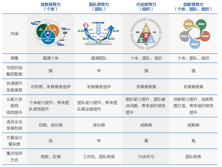 四個模型的主要聯(lián)系在于:優(yōu)勢領(lǐng)導(dǎo)力模型聚焦個體領(lǐng)導(dǎo)力的提升;行動領(lǐng)導(dǎo)力模型從組織的角度聚焦個體領(lǐng)導(dǎo)力的提升;U5卓越團(tuán)隊(duì)模型聚焦團(tuán)隊(duì)領(lǐng)導(dǎo)力的提升;創(chuàng)新領(lǐng)導(dǎo)力模型聚焦個體和團(tuán)隊(duì)創(chuàng)新能力的提升和創(chuàng)新氛圍的形成。下表闡明了優(yōu)勢領(lǐng)導(dǎo)力、行動領(lǐng)導(dǎo)力、U5卓越團(tuán)隊(duì)、創(chuàng)新領(lǐng)導(dǎo)力四個模型之間的聯(lián)系和區(qū)別。