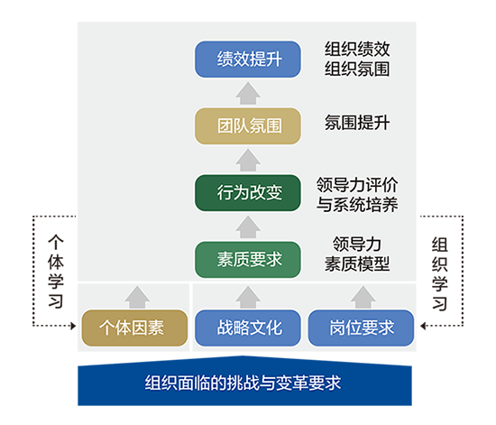 經(jīng)過多年對國內(nèi)外理論和最佳企業(yè)實(shí)踐的研究,百年基業(yè)認(rèn)為,研究領(lǐng)導(dǎo)力發(fā)展的目的在于推動組織變革和實(shí)現(xiàn)公司戰(zhàn)略,幫助組織更好地應(yīng)對所面臨的挑戰(zhàn),其根本目的在于改進(jìn)和提升組織績效。 在個體層面,領(lǐng)導(dǎo)力是根據(jù)組織戰(zhàn)略發(fā)展和變革需要,在復(fù)雜多變環(huán)境下,管理者通過不斷學(xué)習(xí)和綜合運(yùn)用自身特質(zhì)、知識、技能等各種資源,有效解決問題,達(dá)成和提升組織績效的能力和行為。在團(tuán)隊(duì)層面,領(lǐng)導(dǎo)力是通過激活團(tuán)隊(duì)腦,共建愿景與規(guī)則,協(xié)同高效,共同達(dá)成目標(biāo),形成團(tuán)隊(duì)整體行為能力。在組織層面,領(lǐng)導(dǎo)力是打造核心組織能力,塑造學(xué)習(xí)型組織,營造組織文化與管理機(jī)制,積淀和發(fā)展組織智慧的組織行為能力。