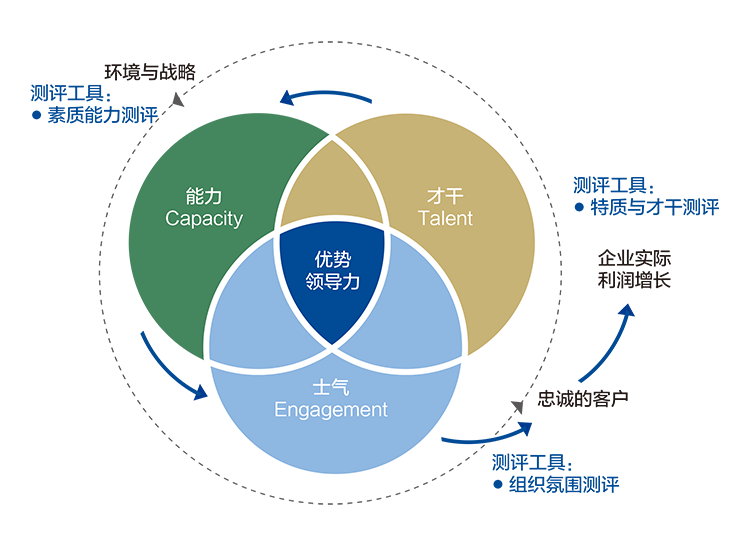 2008年,百年基業(yè)提出了優(yōu)勢領(lǐng)導(dǎo)力模型(Talent—Capacity—Engagement, TCE)。優(yōu)勢領(lǐng)導(dǎo)力模型表明,在組織戰(zhàn)略與生存、競爭的大環(huán)境下,只有通過發(fā)揮領(lǐng)導(dǎo)者的優(yōu)勢和才干、發(fā)展他們的能力、進(jìn)而提升團(tuán)隊(duì)成員的士氣,三管齊下,才能夠?yàn)槠髽I(yè)贏得和保留忠誠的客戶,最終帶動企業(yè)績效的提升和實(shí)際利潤的增長。