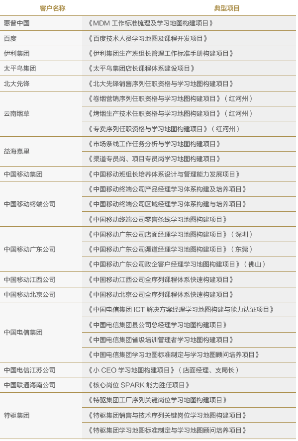 百年優(yōu)學為眾多標桿企業(yè)提供關(guān)鍵人才學習地圖項目的服務(wù),其中:平安集團的《管理啟橙90天O2O項目》榮獲國際績效改進協(xié)會(ISPI)2015“績效改進最佳實踐獎”、培訓雜志2016“中國最佳學習項目獎”;民生銀行《理財經(jīng)理學習地圖及三年培養(yǎng)規(guī)劃項目》榮獲CSTD2016年"學習設(shè)計大賽"銀獎;中國聯(lián)通海南公司《核心崗位學習地圖及員工勝任力SPARK項目》榮獲CSTD2017年"學習設(shè)計大賽"金獎(第一名)。