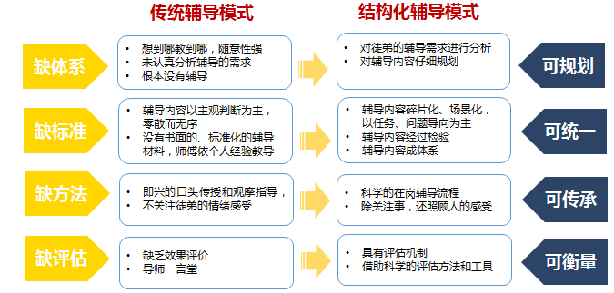 與傳統(tǒng)的“師帶徒”模式和導(dǎo)師制相比,結(jié)構(gòu)化在崗輔導(dǎo)具體以下優(yōu)勢: |