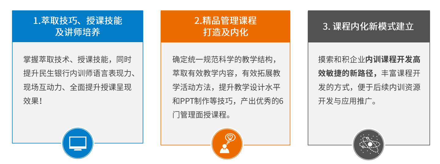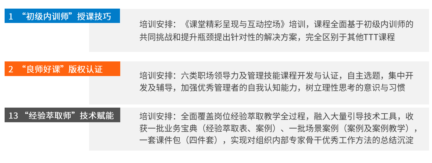 往期案例回顧: 案例四:華發(fā)控股集團-中高層行動學習發(fā)展領導力項目 案例八:某快消品行業(yè)龍頭企業(yè)-學習地圖-核心人才發(fā)展與業(yè)務發(fā)展的鏈接 案例九 股份制商業(yè)銀行“榮耀講師” 內訓師培養(yǎng)與認證項目 項目背景 某股份制商業(yè)銀行信用卡中心有200人講師隊伍,作為企業(yè)培訓體系中重要的組成部分,這批內訓師工作年限不同、崗位不同、工作任務與職責不同,需要激發(fā)他們的興趣。 本次項目分層分類培養(yǎng),針對新任講師進行授課技巧培訓,中級講師做版權管理課程認證,高級講師通過萃取技術賦能,幫助其他骨干進行經(jīng)驗萃取。 本次項目希望通過培養(yǎng)內訓師的萃取能力、課程開發(fā)能力及授課技巧,同時能夠開發(fā)、內化和認證一批外部企業(yè)的優(yōu)秀課程,服務于各個分行的內訓授課、進行知識分享和組織文化傳承。 項目設計 根據(jù)本企業(yè)內訓師角色任務和能力基礎進行組合搭配,根據(jù)內訓師三大核心任務對應多元化課程設置,系統(tǒng)搭建了企業(yè)內訓師梯隊。 1 初級-授課技巧 《TTT:精彩呈現(xiàn)與互動控場》 2 中級-版權認證 《管理課程開發(fā)與認證》 3 高級-技術賦能 《經(jīng)驗萃取、授課技能提升》 項目過程 本項目分三大主題: 01/ “初級內訓師”授課技巧 培訓安排: 《課堂精彩呈現(xiàn)與互動控場》培訓,課程全面基于初級內訓師的共同挑戰(zhàn)和提升瓶頸提出針對性的解決方案,完全區(qū)別于其他TTT課程。 02/ “良師好課”版權認證 培訓安排: 六類職場領導力及管理技能課程開發(fā)與認證,自主選題,集中開發(fā)及輔導,加強優(yōu)秀管理者的自我認知能力,樹立理性思考的意識與習慣。 03/ “經(jīng)驗萃取師”技術賦能 培訓安排: 全面覆蓋崗位經(jīng)驗萃取教學全過程,融入大量引導技術工具,收獲一批業(yè)務寶典(經(jīng)驗萃取表、案例)、一批場景案例(案例及案例教學),一套課件包(四件套),實現(xiàn)對組織內部專家骨干優(yōu)秀工作方法的總結沉淀。 項目成果總結 學員逐個通關演練,講師一一細致反饋,使各位內訓師試講中在內容理解、表達技巧、講授方法、進度把控上都取得了不俗的成績,有效提升內訓師隊伍的整體水平。 下一期將為大家詳細介紹來股份制商業(yè)銀行-【網(wǎng)點效能提升】案例萃取項目,敬請期待哦! 往期案例回顧: 案例四:華發(fā)控股集團-中高層行動學習發(fā)展領導力項目