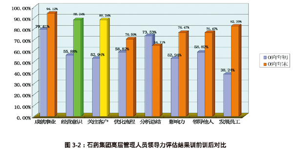 石藥集團(tuán)06 年年初與年末中高層素質(zhì)評(píng)價(jià)結(jié)果對(duì)比顯示,經(jīng)過(guò)一年左右的實(shí)踐學(xué)習(xí),高層管理人員幾乎每一項(xiàng)勝任力特征都有長(zhǎng)足的進(jìn)步,特別是“經(jīng)營(yíng)意識(shí)”和“關(guān)注客戶(hù)”兩項(xiàng)對(duì)于石藥集團(tuán)發(fā)展的關(guān)鍵性指標(biāo),由原先不足60% 提高到接近90% 的水準(zhǔn)。