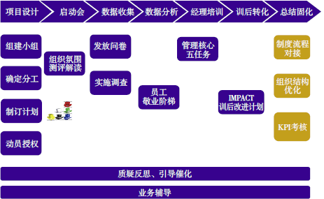 • 項(xiàng)目設(shè)計(jì):旨在做好項(xiàng)目啟動(dòng)前的準(zhǔn)備工作,確定項(xiàng)目組成員與分工,制定項(xiàng)目計(jì)劃,設(shè)計(jì)調(diào)查問(wèn)卷,確定參與調(diào)查的員工名單和匯報(bào)關(guān)系,完成項(xiàng)目動(dòng)員及其準(zhǔn)備工作。這個(gè)階段要確保公司各級(jí)經(jīng)理與員工的重視;