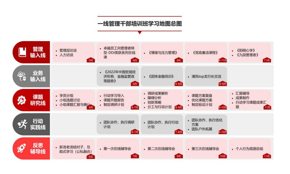 本次項目通過行動學(xué)習(xí)的方式,以核心業(yè)務(wù)為抓手,促進(jìn)一線管理干部團(tuán)隊融合,同時聚焦業(yè)務(wù)發(fā)展中的熱點難點問題,提升公司條線、零售條線管理者發(fā)現(xiàn)問題、解決問題的意識、能力和水平。
