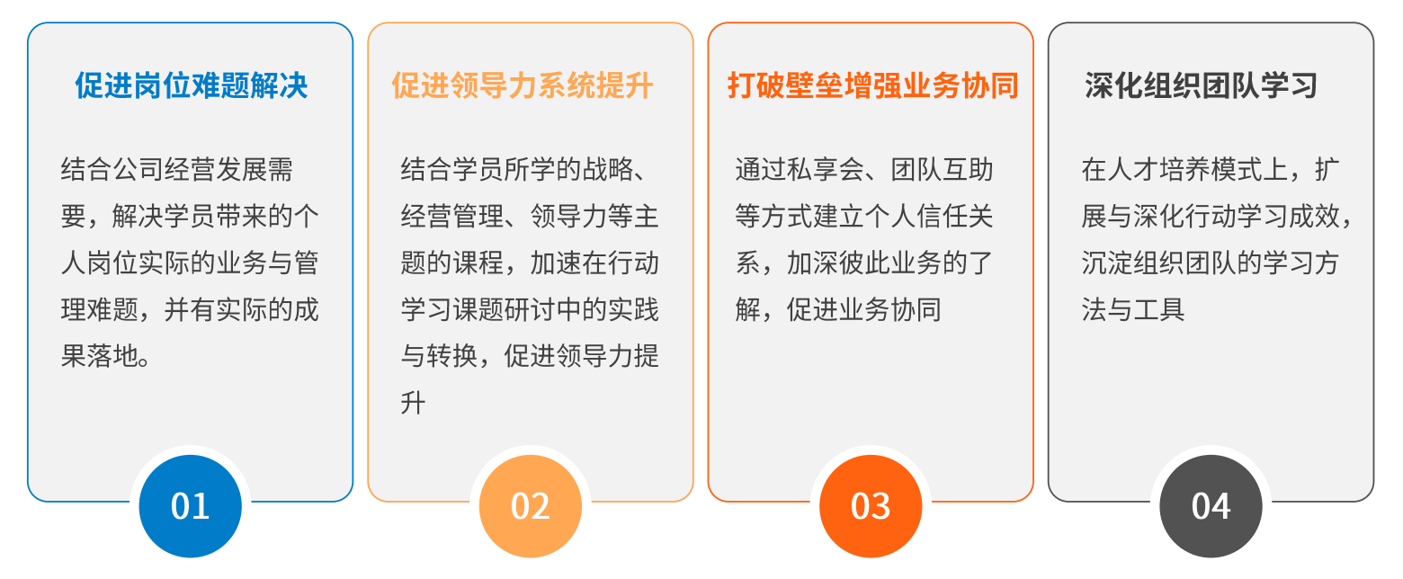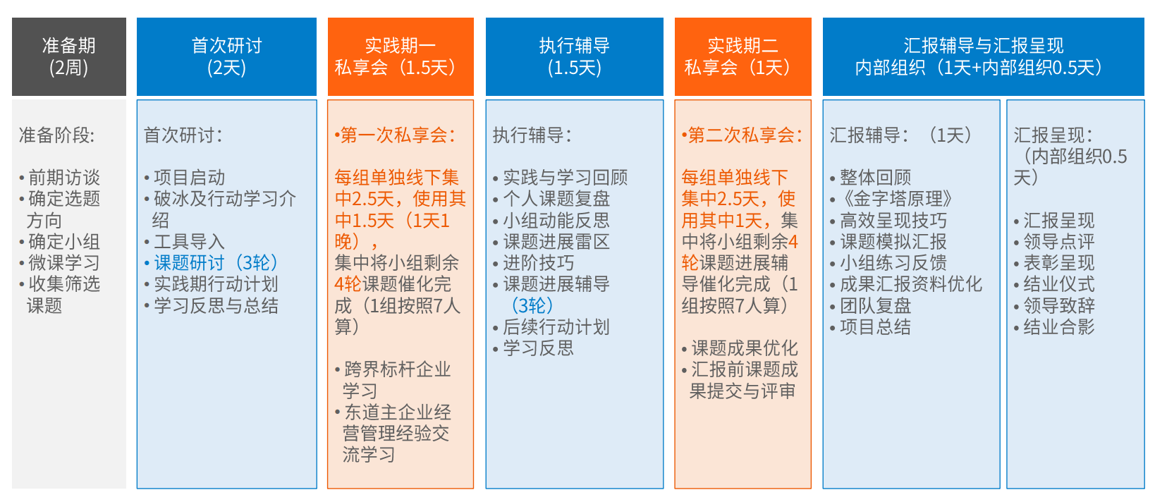 往期案例回顧: 案例一:中國聯(lián)通集團(tuán)-行動學(xué)習(xí)催化師認(rèn)證項(xiàng)目案例 案例四:華發(fā)控股集團(tuán)-中高層行動學(xué)習(xí)發(fā)展領(lǐng)導(dǎo)力項(xiàng)目 案例六 某大型國有集團(tuán) 打造高管行動學(xué)習(xí)項(xiàng)目 項(xiàng)目背景與挑戰(zhàn) 項(xiàng)目背景: 基于新時(shí)代新發(fā)展新歷程,企業(yè)內(nèi)部正在進(jìn)行大力改革,基于業(yè)務(wù)發(fā)展和改革的需要,企業(yè)內(nèi)部將首次引入行動學(xué)習(xí)的模式,針對二級公司部門正職、三級公司一把手、總部職能人員合計(jì)67人,結(jié)合項(xiàng)目中領(lǐng)導(dǎo)力課程的主題,以行動學(xué)習(xí)課題解決為載體發(fā)展學(xué)員領(lǐng)導(dǎo)力,同時(shí)使學(xué)員帶來的崗位挑戰(zhàn)或業(yè)務(wù)難題得到解決,在領(lǐng)導(dǎo)力技能提升的同時(shí),促進(jìn)業(yè)務(wù)單元之間協(xié)同互助,彼此經(jīng)驗(yàn)深度共享,發(fā)現(xiàn)心智模式盲區(qū)促進(jìn)自我覺察。 項(xiàng)目挑戰(zhàn): 運(yùn)營壓力:疫情情況下,如何做好線上線下班級運(yùn)營管理 課題壓力:如何在有限的時(shí)間內(nèi),確保課題得到解決并實(shí)踐落地 技術(shù)轉(zhuǎn)移壓力:如何讓管理者快速掌握行動學(xué)習(xí)技術(shù) 領(lǐng)導(dǎo)力提升壓力:如何在解決難題時(shí)發(fā)展管理者催化型領(lǐng)導(dǎo)力 疫情壓力:疫情不確定的情況下, 保障項(xiàng)目正常推進(jìn) 項(xiàng)目目標(biāo) 目標(biāo)1 促進(jìn)崗位難題解決 結(jié)合公司經(jīng)營發(fā)展需要,解決學(xué)員帶來的個(gè)人崗位實(shí)際的業(yè)務(wù)與管理難題,并有實(shí)際的成果落地。 目標(biāo)2 促進(jìn)領(lǐng)導(dǎo)力系統(tǒng)提升 結(jié)合學(xué)員所學(xué)的戰(zhàn)略、經(jīng)營管理、領(lǐng)導(dǎo)力等主題的課程,加速在行動學(xué)習(xí)課題研討中的實(shí)踐與轉(zhuǎn)換,促進(jìn)領(lǐng)導(dǎo)力提升 目標(biāo)3 打破壁壘增強(qiáng)業(yè)務(wù)協(xié)同 通過私享會、團(tuán)隊(duì)互助等方式建立個(gè)人信任關(guān)系,加深彼此業(yè)務(wù)的了解,促進(jìn)業(yè)務(wù)協(xié)同 目標(biāo)4 深化組織團(tuán)隊(duì)學(xué)習(xí) 在人才培養(yǎng)模式上,擴(kuò)展與深化行動學(xué)習(xí)成效,沉淀組織團(tuán)隊(duì)的學(xué)習(xí)方法與工具 項(xiàng)目設(shè)計(jì)及實(shí)施過程 準(zhǔn)備階段(2周) 前期訪談 確定選題方向 確定小組 微課學(xué)習(xí) 收集篩選課題 首次研討(2天) 項(xiàng)目啟動 破冰及行動學(xué)習(xí)介紹 工具導(dǎo)入 課題研討(3輪) 實(shí)踐期行動計(jì)劃 學(xué)習(xí)反思與總結(jié) 實(shí)踐期第一次私享會(1.5天) 第一次私享會: 每組單獨(dú)線下集中2.5天,使用其中1.5天(1天1晚),集中將小組剩余4輪課題催化完成(1組按照7人算) 跨界標(biāo)桿企業(yè)學(xué)習(xí) 東道主企業(yè)經(jīng)營管理經(jīng)驗(yàn)交流學(xué)習(xí) 執(zhí)行輔導(dǎo)(1.天) 實(shí)踐與學(xué)習(xí)回顧 個(gè)人課題復(fù)盤 小組動能反思 題進(jìn)展雷區(qū) 進(jìn)階技巧 課題進(jìn)展輔導(dǎo)(3輪) 后續(xù)行動計(jì)劃 學(xué)習(xí)反思 實(shí)踐期第二次私享會(1天) 第二次私享會: 每組單獨(dú)線下集中2.5天,使用其中1天,集中將小組剩余4輪課題進(jìn)展輔導(dǎo)催化完成(1組按照7人算) 課題成果優(yōu)化 匯報(bào)前課題成果提交與評審 匯報(bào)輔導(dǎo):(1天) 整體回顧 《金字塔原理》 高效呈現(xiàn)技巧 課題模擬匯報(bào) 小組練習(xí)反饋 成果匯報(bào)資料優(yōu)化 團(tuán)隊(duì)復(fù)盤 項(xiàng)目總結(jié) 匯報(bào)呈現(xiàn):(內(nèi)部組織0.5天) 匯報(bào)呈現(xiàn) 領(lǐng)導(dǎo)點(diǎn)評 表彰呈現(xiàn) 結(jié)業(yè)儀式 領(lǐng)導(dǎo)致辭 結(jié)業(yè)合影 項(xiàng)目設(shè)計(jì)核心原則 原則1使用小組多課題模式解決崗位挑戰(zhàn) 本項(xiàng)目基于學(xué)員業(yè)務(wù)單元類型差異大,同時(shí)學(xué)員崗位多樣且差異大的特點(diǎn),經(jīng)反復(fù)權(quán)衡比較,以MP小組多課題模式(Multiple Problem)為主要的項(xiàng)目開展方式,4-6個(gè)月結(jié)項(xiàng),3個(gè)集中期,每個(gè)集中期間隔2個(gè)月左右。 原則2組組配外部行動學(xué)習(xí)催化師 本項(xiàng)目中,為提升項(xiàng)目交付質(zhì)量與效率,確保行動學(xué)習(xí)研討與催化高效、專業(yè)達(dá)成,我們將采用“組組配外部催化師”的方式。優(yōu)勢如下: 原則3選題緊貼戰(zhàn)略、業(yè)務(wù)要求、領(lǐng)導(dǎo)力短板 每一位學(xué)員選題需經(jīng)過四大選題流程: 步驟一:訪談發(fā)起人 項(xiàng)目開始前與2-3位發(fā)起人開展訪談,了解項(xiàng)目目的,明確選題方向與范圍 步驟二:填寫選題表 結(jié)合領(lǐng)導(dǎo)力模型能力維度與業(yè)務(wù)指標(biāo)及現(xiàn)狀的差距、痛點(diǎn)部分進(jìn)行選題,填寫提交《行動學(xué)習(xí)選題說明表》(主選+備選,共2個(gè)) 步驟三:上級給反饋 學(xué)員上級將根據(jù)組織戰(zhàn)略目標(biāo)重點(diǎn)與學(xué)員業(yè)務(wù)指標(biāo)和達(dá)成現(xiàn)狀之間的差距觀察,提出自己對學(xué)員課題的意見反饋 步驟四:內(nèi)外嚴(yán)把關(guān) 百年基業(yè)顧問會同內(nèi)部項(xiàng)目組,