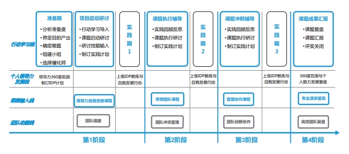 第 1 條線 :行動學(xué)習(xí)線 對于行動學(xué)習(xí)線,難題的確定過程是關(guān)鍵。首先由項目發(fā)起人確定難題選擇范圍,然后每位學(xué)員提交兩個課題,經(jīng)過上級審核,再由 HR 和顧問老師進一步審核確認(rèn),從專業(yè)視角判斷行動學(xué)習(xí)難題的適用性。 4 次集中研討的重點說明如下: 第 1 次 :小組教練使用行動學(xué)習(xí)畫布工具,研討組內(nèi)每位學(xué)員的課題。每個課題從模糊到逐漸清晰都會經(jīng)歷高質(zhì)量的重構(gòu)環(huán)節(jié),結(jié)束前設(shè)定實踐期的課題目標(biāo)和行動計劃。 高潛圓桌會四階段項目設(shè)計流程 第 2 次:學(xué)員經(jīng)歷了實踐行動,遇到了新的挑戰(zhàn)之后,對課題再次進行研討,結(jié)合目標(biāo)重新審視更新的方案和行動計劃。 第 3 次:課題初見成果,這時要進行第 3 次研討,為課題解決做好沖刺準(zhǔn)備,以及做好課題成果的創(chuàng)新提煉。 第 4 次 :進行課題復(fù)盤、團隊復(fù)盤和個人復(fù)盤,同時進行課題匯報輔導(dǎo),最后進行結(jié)業(yè)匯報。