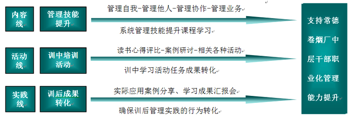 通過全面深入需求分析,訪談與焦點(diǎn)小組調(diào)研結(jié)果分析,并結(jié)合08年公司管理工作的特點(diǎn),常德卷煙廠和百年基業(yè)合作設(shè)計(jì)了《常德卷煙廠中層干部職業(yè)化提升領(lǐng)導(dǎo)力發(fā)展項(xiàng)目》,主要由以下三條主線來展開培訓(xùn):
