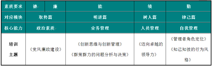 "領(lǐng)導(dǎo)力內(nèi)容線"說明二:提升新任處級干部領(lǐng)導(dǎo)力遵循從以下五個(gè)維度進(jìn)行為期五天的集中培訓(xùn):
