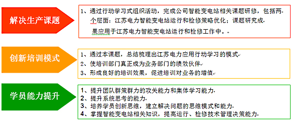 針對該課題,江蘇電力與北京百年基業(yè)管理顧問公司進(jìn)行了精心的設(shè)計,按照 "提出問題-反思-總結(jié)-計劃-行動-發(fā)現(xiàn)新問題-再反思"的行動學(xué)習(xí)流程,期望通過4-5個月的時間,實(shí)現(xiàn)三個方面的收益: