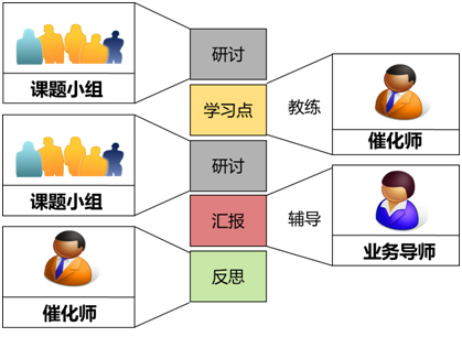 項目中采用了催化師、學(xué)習(xí)小組、業(yè)務(wù)導(dǎo)師三種角色有機結(jié)合的方式,并達成全方位、立體式幫助學(xué)員能力提升。