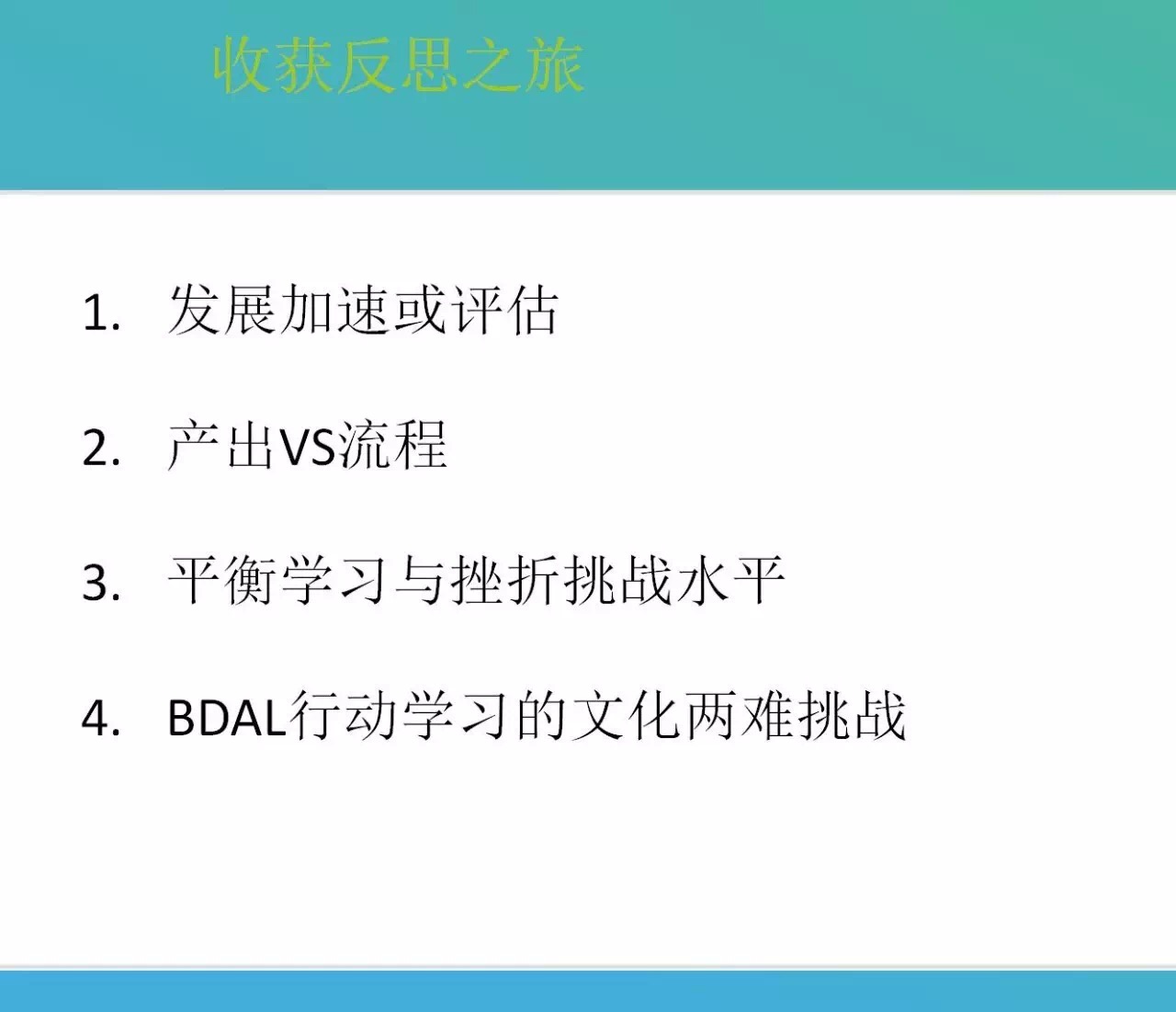 這個(gè)項(xiàng)目是典型的BDAL模式,跨界元素在該項(xiàng)目中非常重要,OUT SIDE IN,先向外看,再向內(nèi)看,先看別的組織,再看自己的組織,先看別的成員,再看自己。跨界與一般跨界的最大差異是,找到與自己面臨類(lèi)似挑戰(zhàn)的企業(yè),而不僅僅是單方向?qū)W習(xí),解決自己?jiǎn)栴}的過(guò)程也解決他人的問(wèn)題,并從中有學(xué)習(xí)。