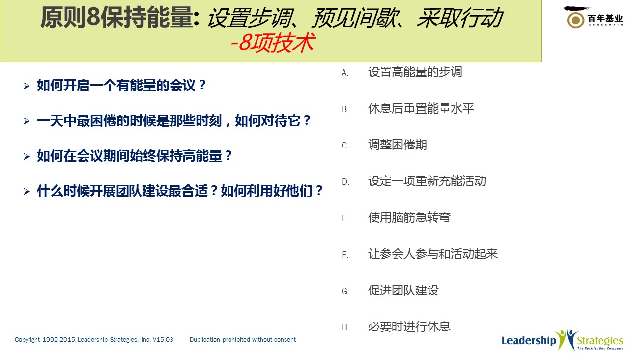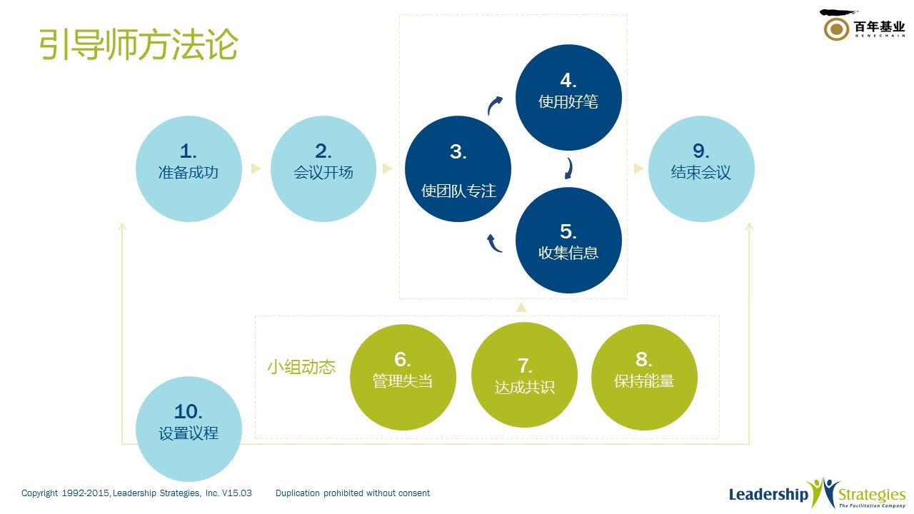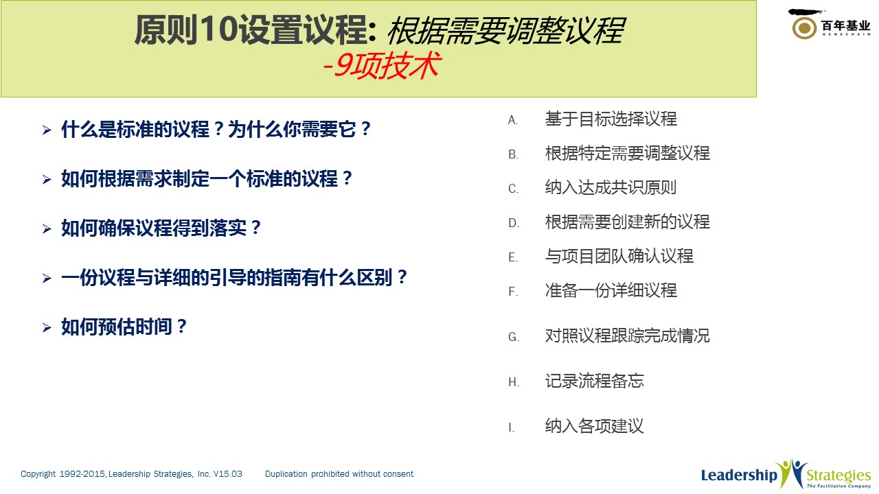 8、保持能量 一個(gè)場域的營造對引導(dǎo)師來說非常關(guān)鍵,如何去保持引導(dǎo)師能量,以及引導(dǎo)師要知道在一天當(dāng)中到底那些時(shí)刻是大家會(huì)疲憊的,我們?nèi)绾稳ッ鎸λ?,在?huì)議期間如何持續(xù)保持高能量,要開展哪些團(tuán)隊(duì)活動(dòng)。 建議引導(dǎo)師從三級能量開始,把控團(tuán)隊(duì)當(dāng)中的能量狀態(tài),團(tuán)隊(duì)動(dòng)態(tài)是引導(dǎo)原則當(dāng)中非??粗氐囊粋€(gè)部分。 9、結(jié)束會(huì)議 會(huì)議的結(jié)束要分為四個(gè)部分:回顧完成的活動(dòng)、目標(biāo)和產(chǎn)出,回顧實(shí)現(xiàn)的個(gè)人目標(biāo),評估整個(gè)會(huì)議的成效,告訴大家下一步要做什么,結(jié)束會(huì)議。同時(shí)向發(fā)起人和策劃團(tuán)隊(duì)總結(jié)匯報(bào)整體會(huì)議情況,所以大家看到很多引導(dǎo)師上完課都覺得很多工作都沒做,會(huì)議往往都是草草結(jié)束的。作為一個(gè)引導(dǎo)師,有11項(xiàng)技術(shù)在結(jié)束會(huì)議是要完成的,每一項(xiàng)技術(shù)都是非常關(guān)鍵的部分,引導(dǎo)師可以看一下在現(xiàn)場是不是每一次都做到了。 10、設(shè)置議程 一個(gè)完整的引導(dǎo)型會(huì)議應(yīng)該在準(zhǔn)備工作時(shí)界定需求,同時(shí)設(shè)置議程,通過議程在現(xiàn)場實(shí)施,來完成兩個(gè)循環(huán),一個(gè)是事情的循環(huán),一個(gè)是團(tuán)隊(duì)的循環(huán)來結(jié)束會(huì)議。 很多企業(yè)里有標(biāo)準(zhǔn)的議程,比如戰(zhàn)略規(guī)劃的流程,問題分析解決的流程,跨部門溝通的流程可以進(jìn)行參考。但是很多企業(yè)沒有標(biāo)準(zhǔn)的議程,我們?nèi)绾螐陌l(fā)起人的訪談中找到關(guān)鍵問題,并通過這些關(guān)鍵問題來設(shè)計(jì)議程,設(shè)計(jì)議程的時(shí)候時(shí)間怎么分配,要準(zhǔn)備哪些物品。原則10中有9項(xiàng)技術(shù)可以幫助大家設(shè)計(jì)好議程。