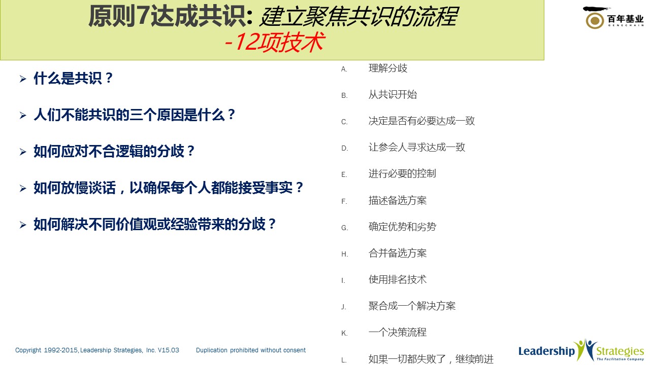 7、達(dá)成共識 “達(dá)成共識”是高級引導(dǎo)策略的內(nèi)容,包括:如何處理團(tuán)隊(duì)分歧和沖突,如何讓團(tuán)隊(duì)作出決策,是非常困難的一個(gè)部分。在達(dá)成共識這部分會(huì)讓大家了解共識的定義是什么?并非每個(gè)人都同意就叫共識。當(dāng)出現(xiàn)分歧時(shí),包括事實(shí)不一致,價(jià)值觀、假設(shè)不一樣,外部因素,這是三個(gè)類型的分歧,我們該采取什么應(yīng)對辦法。 這里會(huì)給大家講解12項(xiàng)技術(shù),從共識目標(biāo)開始,找大家的分歧是什么,判斷是一級分歧二級分歧還是三級分歧呢?假如是一級分歧,我們要把事實(shí)描述出來看大家理解的一致不一致。如果是二級分歧那么還要描述備選方案,確定優(yōu)劣勢,還要看核心優(yōu)勢是什么,讓大家找妥協(xié)性的解決方案,并且把這個(gè)備選方案合并起來,如果還不能解決共識,那我們可能用聚合的方法,用五指共識的方法真正的來解決前面的三種分歧,共識的過程中教授的方法就是以現(xiàn)場實(shí)際演練去完整的體驗(yàn)一個(gè)促進(jìn)共識的過程。這是一個(gè)高級的引導(dǎo)技巧。