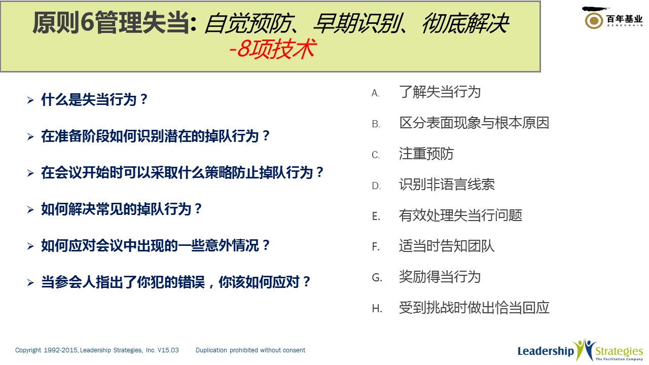 6、管理失當(dāng)行為 在引導(dǎo)過程中,有4類人要特別關(guān)注:不愿意參加會(huì)議的人,因會(huì)議目標(biāo)實(shí)現(xiàn)而利益受損的人,跟參會(huì)人有利益沖突的人,在會(huì)議中只唱反調(diào)而不提出解決方案的人。 在準(zhǔn)備工作中,我們就要自覺預(yù)防,所以在管理失當(dāng)里告訴大家什么是失當(dāng)行為,有可能是對會(huì)議的內(nèi)容、流程和外部因素造成不滿的情緒,我們不能只關(guān)注行為,還要關(guān)注行為背后的原因有哪些。所以幫助大家在提前準(zhǔn)備工作時(shí)需要注意的事項(xiàng)有哪些,如果現(xiàn)場遇到失當(dāng)行為該如何處理,在處理過程中怎么徹底解決此類問題,此外還有一些意外情況,有8項(xiàng)技術(shù)可以去學(xué)習(xí)。所以一個(gè)引導(dǎo)師要眼觀六路耳聽八方,包括前期的準(zhǔn)備都在預(yù)防前面所說的6個(gè)問題,預(yù)防的策略、識別的策略、徹底解決的策略,包括一些話術(shù)都會(huì)去教到大家。