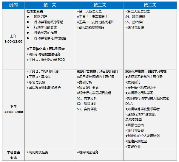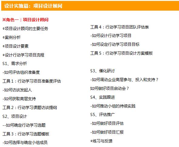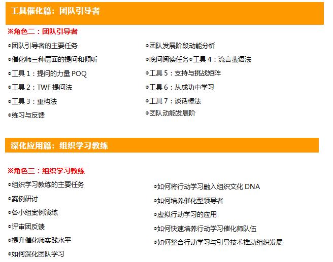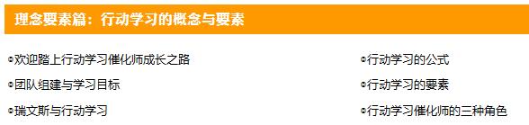 | 重點學習行動學習催化師的三個角色:1、項目設計顧問;2、團隊引導者;3、組織學習教練。學員將在三天內掌握行動學習團隊引導者必備的催化工具,能夠準確分析項目需求,并有效設計項目方案,組建行動學習小組,成功啟動并管理行動學習項目。 | ||||||