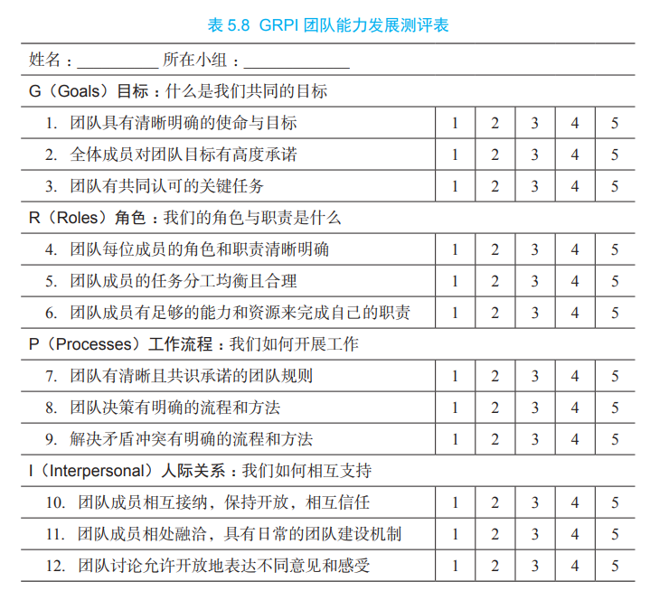 團隊動能干預工具——GRPI 團隊能力復盤 在實踐輔導階段,即項目第 2、第 3 階段,可以采用團隊能力復盤的方式,幫助小組更好地覺察自己處于哪個團隊發(fā)展階段,并對團隊動能進行鞏固和提升。 團隊能力復盤的工具很多,這里介紹一下 GRPI 團隊復盤工具(由百年基業(yè)開發(fā),以下有介紹)。這是在 GRPI 模型的基礎上開發(fā)的。這個工具可以讓小組成員停下來共同反思,“共同看見”團隊績效和團體動力方面的問題。GRPI 是測試團隊能力發(fā)展的模型,包含 Goals(目標)、Roles(角色)、Processes(工作流程)、Interpersonal(人際關系)4 個維度和 12 個子維度。 GRPI 團隊能力復盤是針對團隊設定的 GRPI 團隊能力發(fā)展目標,進行階段性復盤總結的工具。通過對團隊能力發(fā)展目標和事實過程的回顧,分析總結團隊能力發(fā)展過程中存在的經驗教訓,從而更好地促進團隊能力的發(fā)展。以下兩個活動可以更好地幫助你提升團隊動能。 活動一 :GRPI 團隊能力前測