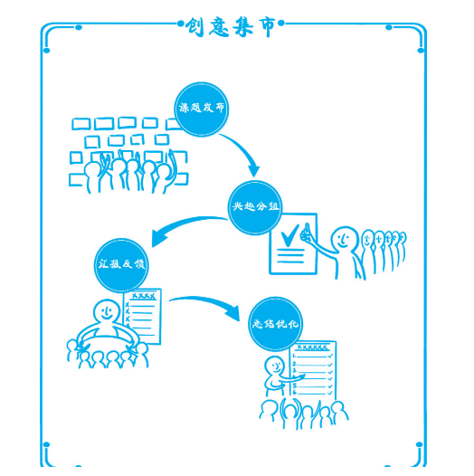 2)創(chuàng)意集市 目的 :創(chuàng)意集市是一種很有活力的課題輔導形式。這種方式可以暫時打破原有小組建制,讓全班學員重新組合進行研討。這樣一方面可以加強全班學員的連接,另一方面也可以匯集更多人的智慧,共同解決難題。 操作說明 :創(chuàng)意集市通常會經過課題發(fā)布、興趣分組、匯報反饋、總結優(yōu)化 4 個步驟,操作示意如圖所示。