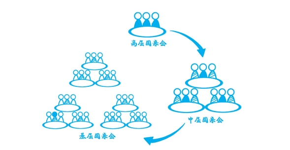 培養(yǎng)內(nèi)部催化師,接力式催化 要想真正推進(jìn)戰(zhàn)略落地,一次性的行動學(xué)習(xí)只能算一個(gè)良好的開端,肯定不能一勞永逸。為此,和客戶共同設(shè)計(jì)了后續(xù)的一系列行動學(xué)習(xí)工作坊。集團(tuán)本次召集的是高級別管理者,這些人回到自己的區(qū)域,將繼續(xù)召集本區(qū)域下一級別管理者進(jìn)行類似的研討。 如此多場次的催化,不可能完全借助外部催化師來實(shí)施。為了讓項(xiàng)目順利進(jìn)行,組織了 F 公司的內(nèi)部催化師訓(xùn)練。原則上,基層的研討,由內(nèi)部催化師帶領(lǐng) ;中層的研討,由外部催化師擔(dān)任主顧問,內(nèi)部催化師負(fù)責(zé)每個(gè)小組的具體催化。 這樣多層行動學(xué)習(xí)的設(shè)計(jì)(見下圖),一層層不斷納入更多員工,才能真正推進(jìn)變革在組織內(nèi)的真正落實(shí)。 多層行動學(xué)習(xí)的設(shè)計(jì)