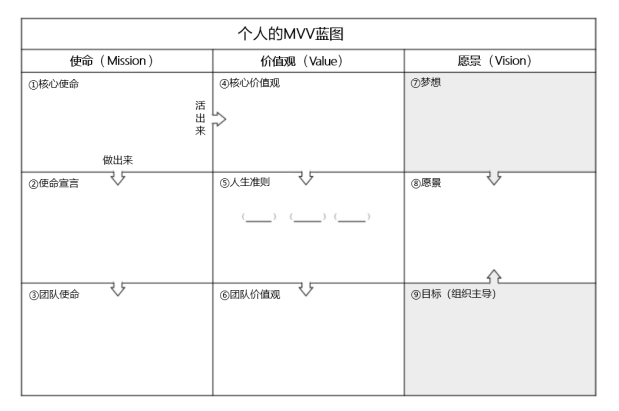 真北團(tuán)隊(duì)是基于使命的生命成長共同體,而我們個人的真北就是我們的MVV[Mission(使命),Vision(愿景),Value(價(jià)值觀)]。每個人加入這個小組之后,必須使用個人的 MVV 藍(lán)圖(見下圖 )明晰自己的使命、愿景、價(jià)值觀。當(dāng)每位成員都明晰了自己的 MVV 之后,在探討難題、做出重要決策時(shí),就有了堅(jiān)實(shí)的抓手。