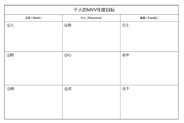 此外,還需要結(jié)合個人的 MVV,從工作、個人和家庭 3 個大維度、9 個子維度,設(shè)定自己的年度目標(biāo)(見下圖),以指導(dǎo)我們切實(shí)地活出自己的MVV。當(dāng)進(jìn)行每月復(fù)盤時(shí),也要不斷核對年度目標(biāo)的達(dá)成情況。