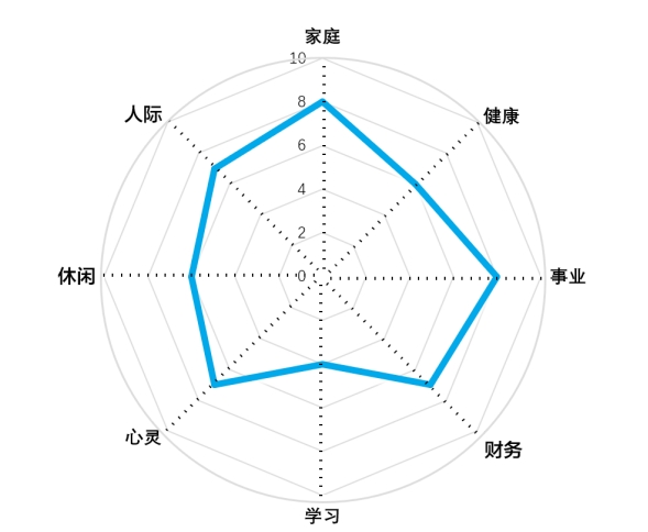 這個工具可以幫助找到自己相對欠缺和不滿意的方面,告訴人們哪個部分已經(jīng)失衡了。如一位伙伴評估之后,發(fā)現(xiàn)學(xué)習(xí)維度的得分很低。他這才意識到已經(jīng)很久沒有關(guān)注個人發(fā)展和能力成長了,于是他就提出了一個個人成長方面的難題。