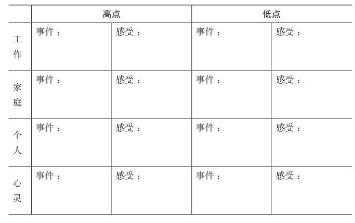 每次活動我們都會使用“高點(diǎn)與低點(diǎn)”工具(見下表),從工作、家庭、個人、心靈 4 個維度做復(fù)盤,回顧過去一個月發(fā)生的事情。每個維度都會分享高點(diǎn)事件和低點(diǎn)事件。分享高點(diǎn)事件時(shí),我們都感覺到一種勝利的快感 ;分享低點(diǎn)事件時(shí),我們也會感到彼此有連接,為各自提供支持。這種系統(tǒng)的月度復(fù)盤對人的成長十分有益,如果沒有創(chuàng)業(yè)家圓桌會,相信很難堅(jiān)持做這樣有價(jià)值的事情。